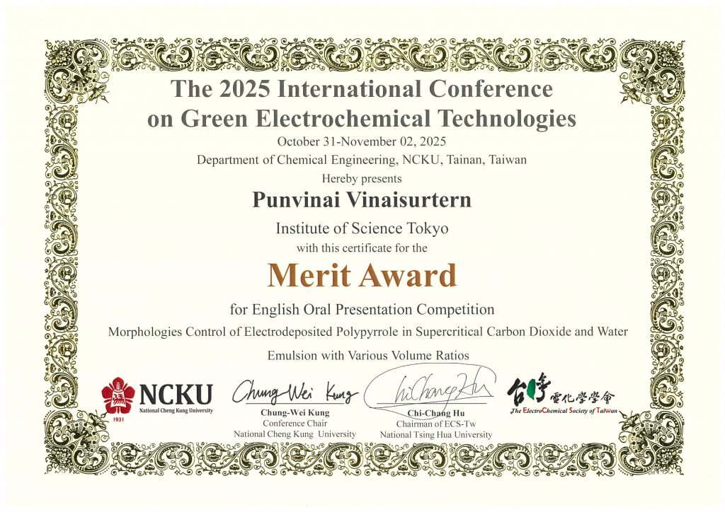 Merit Award;Punvinai Vinaisuratern(D1), “Morphologies Control of Electrodeposited Polypyrrole in Supercritical Carbon Dioxide and Water Emulsion with Various Volume Ratios”