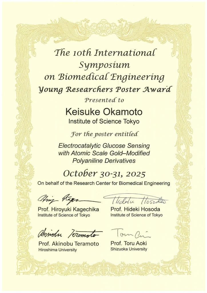 Young Reserchers Poster Award;Keisuke Okamoto(D2), “Electrocatalytic Glucose Sensing with Atomic Scale Gold-Modified Polyaniline Derivatives”